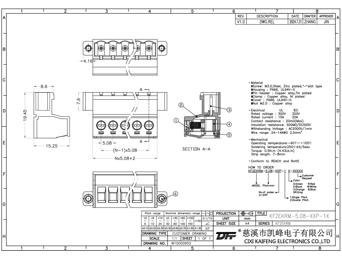 MATERIAL:MATERIALScrews: M3.0,Steel Zinc platedcontact: Phosphor bronzePin header: -Housing: PA66,UL94V-0ElectricalULIECRated voltage300V 320V Rated current15A20AContact resistance20mΩInsulation resistance500MΩ/DC500VWithstanding voltage AC2000V/1minWire range24-14AWG 2.5mm2MechanicalTemp.rang-40℃~+105℃ Max.soldering+250℃, 5s