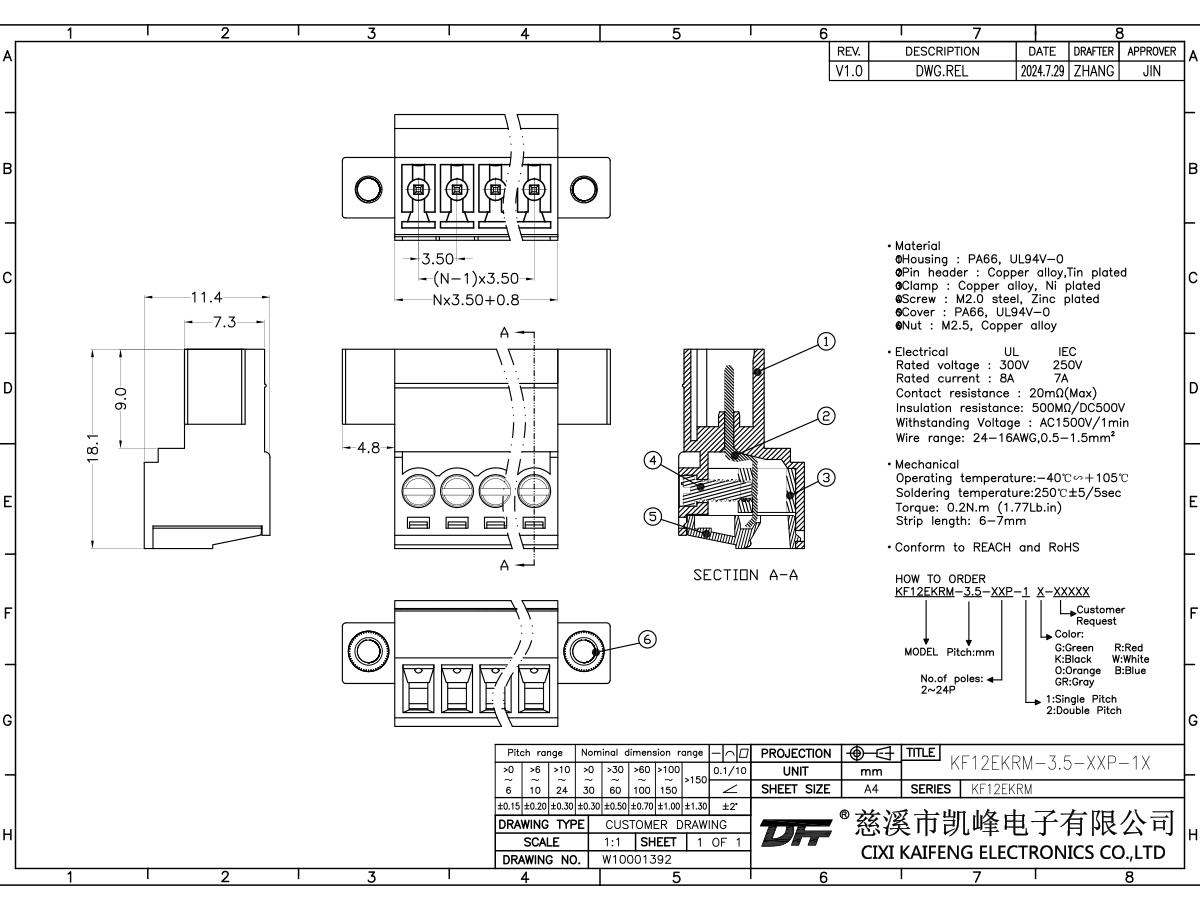 Pluggable Terminal Block MATERIAL:M2.5,Steel Zinc platedClip:Phosphor bronze,Tin Platedcontact:Brass,Tin PlatedHousing:PA66,UL94V-0ElectricalULIECRated voltage300V250VRated current8A7AContact resistance20mΩInsulation resistance500MΩ/DC500VWithstanding voltage AC1500V/1minWire range26-28AWG0.5-1.5mm2MechanicalTemp.rang-40℃~+105℃Max.soldering+250℃,5secTorque0.2N.m2.4kgf.cmStrip length6-7mm