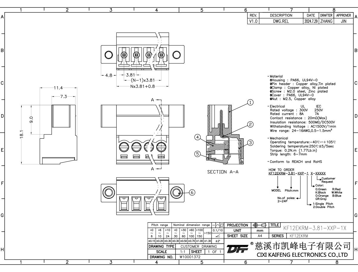 Pluggable Terminal Block MATERIAL:M2.5,Steel Zinc platedClip:Phosphor bronze,Tin Platedcontact:Brass,Tin PlatedHousing:PA66,UL94V-0ElectricalULIECRated voltage300V250VRated current8A7AContact resistance20mΩInsulation resistance500MΩ/DC500VWithstanding voltage AC1500V/1minWire range26-28AWG0.5-1.5mm2MechanicalTemp.rang-40℃~+105℃Max.soldering+250℃,5secTorque0.2N.m2.4kgf.cmStrip length6-7mm