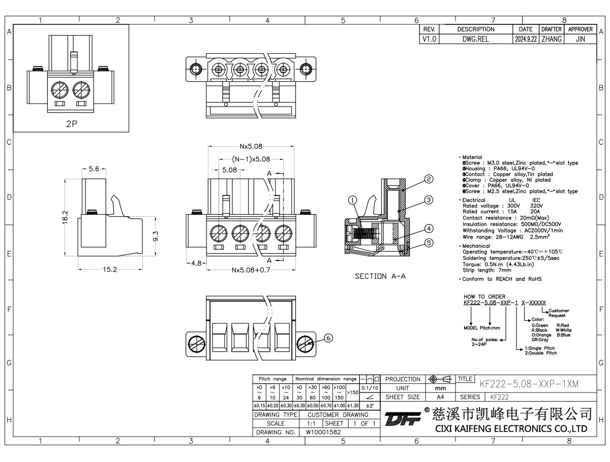 Pluggable Terminal Block MATERIAL:M2.5,Steel Zinc platedcontact:Phosphor bronzePin header:-Housing:PA66,UL94V-0ElectricalULIECRated voltage300V320VRated current15A10AContact resistance20mΩInsulation resistance500MΩ/DC500VWithstanding voltage AC2000V/1minWire range28-12AWG2.5mm2MechanicalTemp.rang-40℃~+105℃Max.soldering+250℃,5secTorque0.4N.m3.5Lb.inStrip length7-8mm