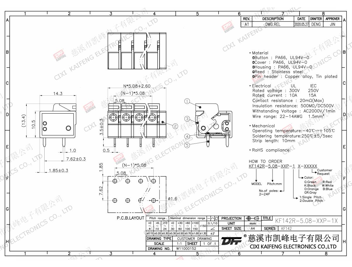 Material:①Button:PA66,UL94V-0②Cover:PA66,UL94V-0③Button:PA66,UL94V-0④Reed:Stainless steel⑤Pin header:Brass,Tin platedElectricalULIECRated voltage300V 250V Rated current10A15AContact resistance20mΩInsulation resistance500MΩ/DC500VWithstanding voltage AC2000V/1minWire range22-14AWG 1.5mm2MechanlicalTemp.rang-40℃~+105℃ Max.soldering+250℃,5sec