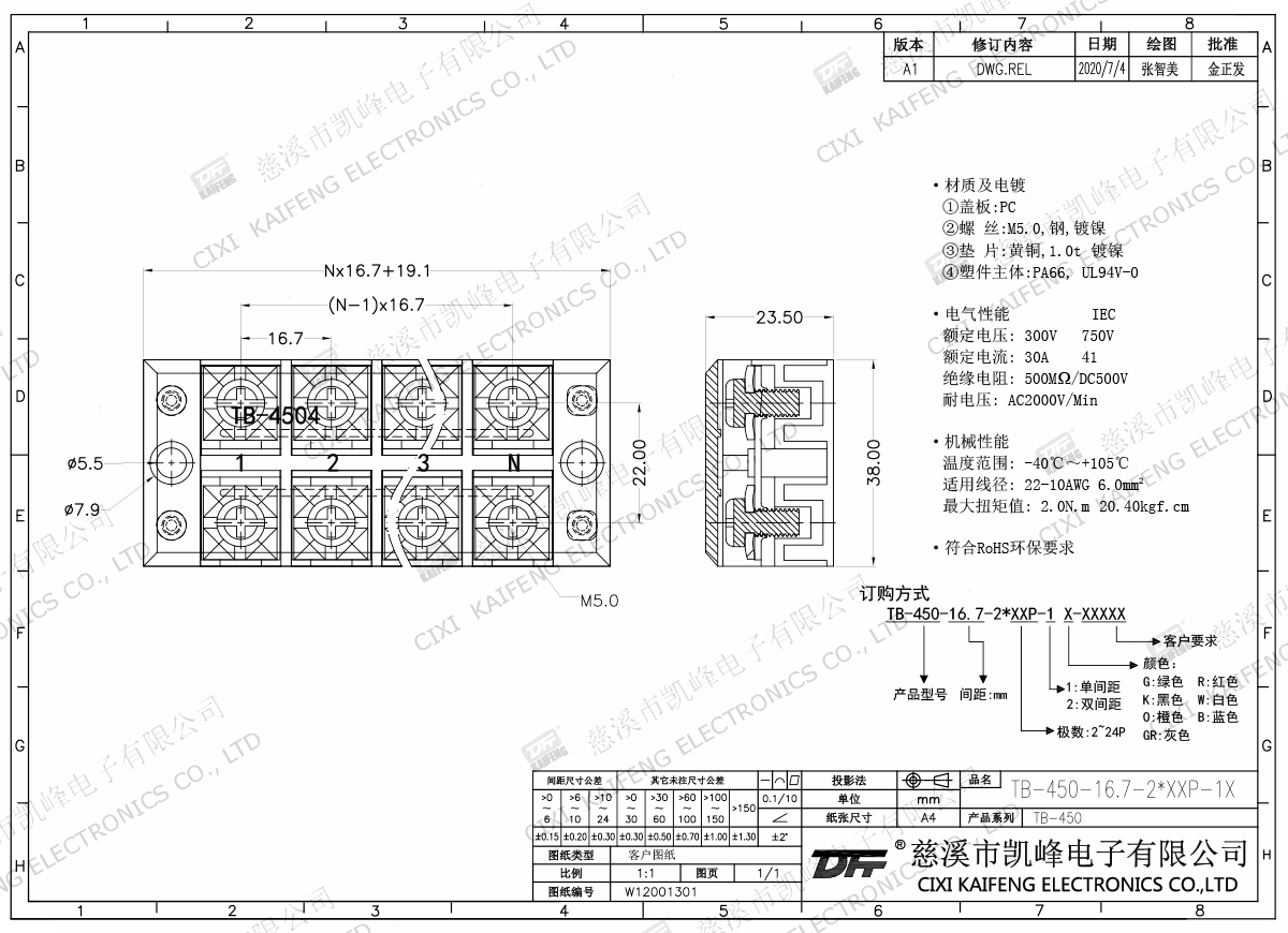 Material:M5.0 Steel,Ni platedTerminal:Brass,1.0t Ni platedHousing: PCElectricalULIECRated voltage300V 750V Rated current30A41AInsulation resistance500MΩ/DC500VWithstanding voltage AC2000V/1minWire range22-10AWG 6.0mm2MechanlicalTemp.rang-40℃~+105℃ Torque2.0N.m 17.54Lb.in