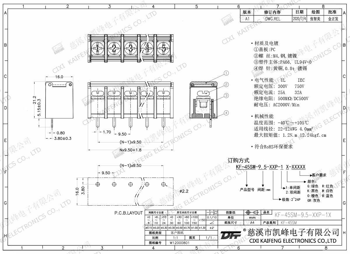 材質(zhì)電鍍:M4.0 鋼,鍍鎳端子:黃銅,0.8t 鍍鎳塑件: PA66,UL94V-0電氣性能ULIEC額定電壓300V 750V 額定電流25A32A絕緣電阻500MΩ/DC500V耐電壓AC2000V/1min使用線徑22-12AWG 4.0mm2機械性能溫度范圍-40℃~+105℃ 扭矩1.2N.m 10.53Lb.in