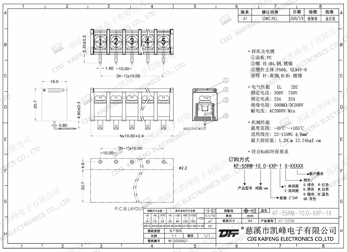材質(zhì)電鍍:M4.0 鋼,鍍鎳端子:黃銅,0.8t 鍍鎳塑件: PA66,UL94V-0電氣性能ULIEC額定電壓300V 750V 額定電流25A32A絕緣電阻500MΩ/DC500V耐電壓AC2000V/1min使用線徑22-12AWG 4.0mm2機械性能溫度范圍-40℃~+105℃ 扭矩1.2N.m 10.53Lb.in
