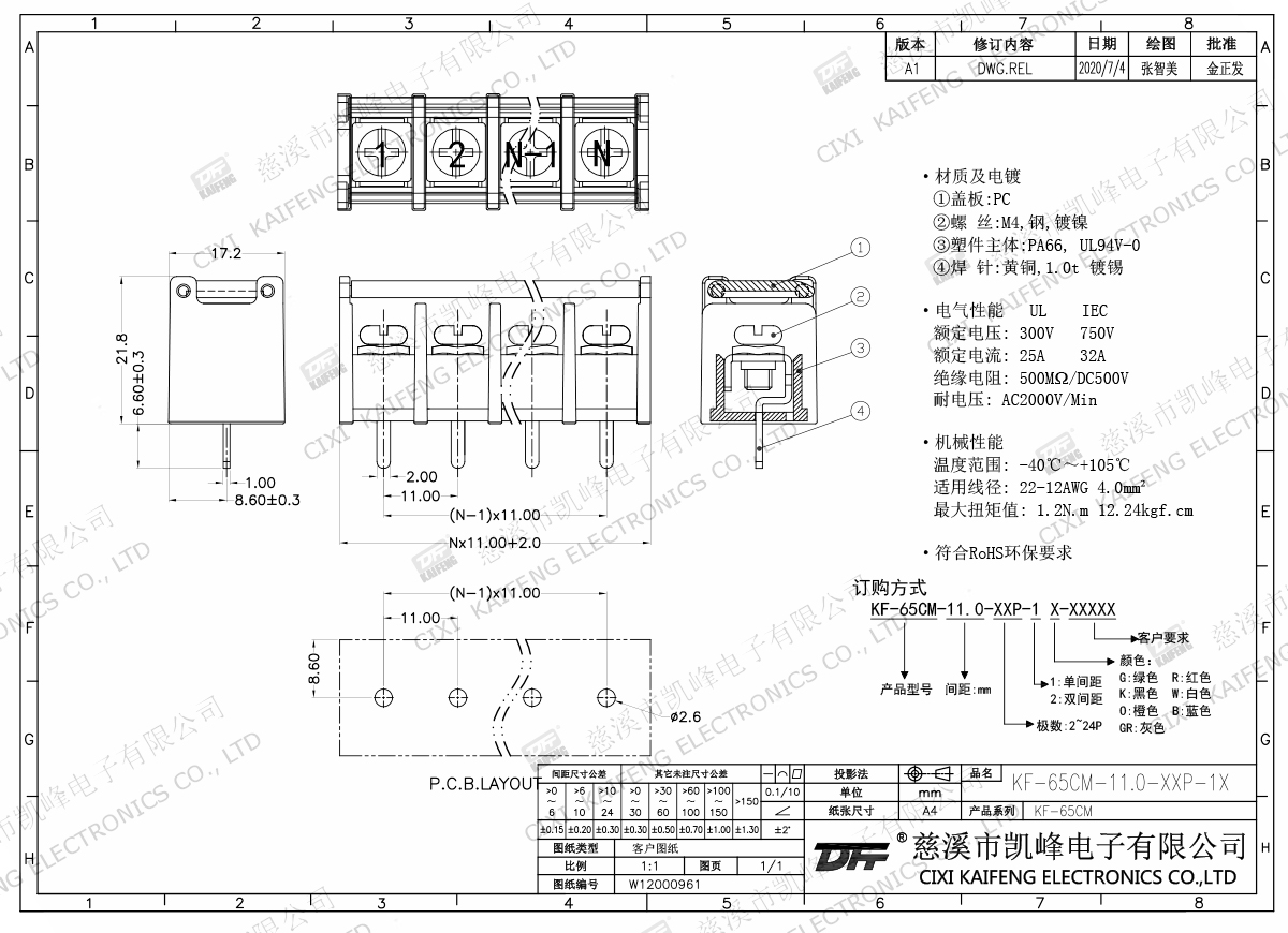 柵欄式接線端子 材質(zhì)電鍍:M4.0 鋼,鍍鎳端子:黃銅,0.8t 鍍鎳塑件: PA66,UL94V-0電氣性能ULIEC額定電壓300V 750V 額定電流30A32A絕緣電阻500MΩ/DC500V耐電壓AC2000V/1min使用線徑22-12AWG 4.0mm2機(jī)械性能溫度范圍-40℃~+105℃ 扭矩1.2N.m 10.53Lb.in