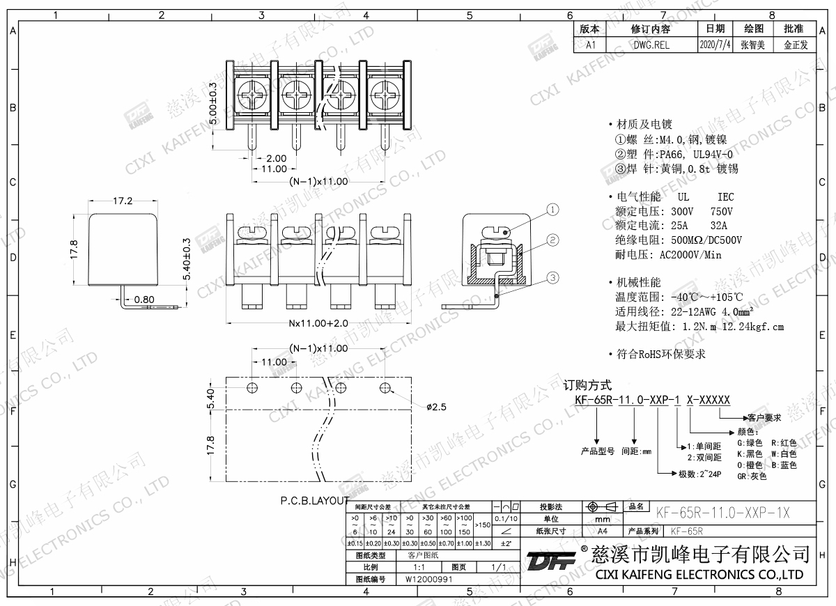 材質電鍍:M4.0 鋼,鍍鎳端子:黃銅,0.8t 鍍鎳塑件: PA66,UL94V-0電氣性能ULIEC額定電壓300V 750V 額定電流30A32A絕緣電阻500MΩ/DC500V耐電壓AC2000V/1min使用線徑22-12AWG 4.0mm2機械性能溫度范圍-40℃~+105℃ 扭矩1.2N.m 10.53Lb.in