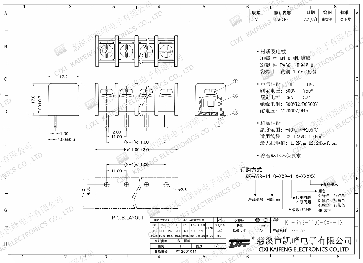 柵欄式接線端子 材質(zhì)電鍍:M4.0 鋼,鍍鎳端子:黃銅,0.8t 鍍鎳塑件: PA66,UL94V-0電氣性能ULIEC額定電壓300V 750V 額定電流30A32A絕緣電阻500MΩ/DC500V耐電壓AC2000V/1min使用線徑22-12AWG 4.0mm2機(jī)械性能溫度范圍-40℃~+105℃ 扭矩1.2N.m 10.53Lb.in