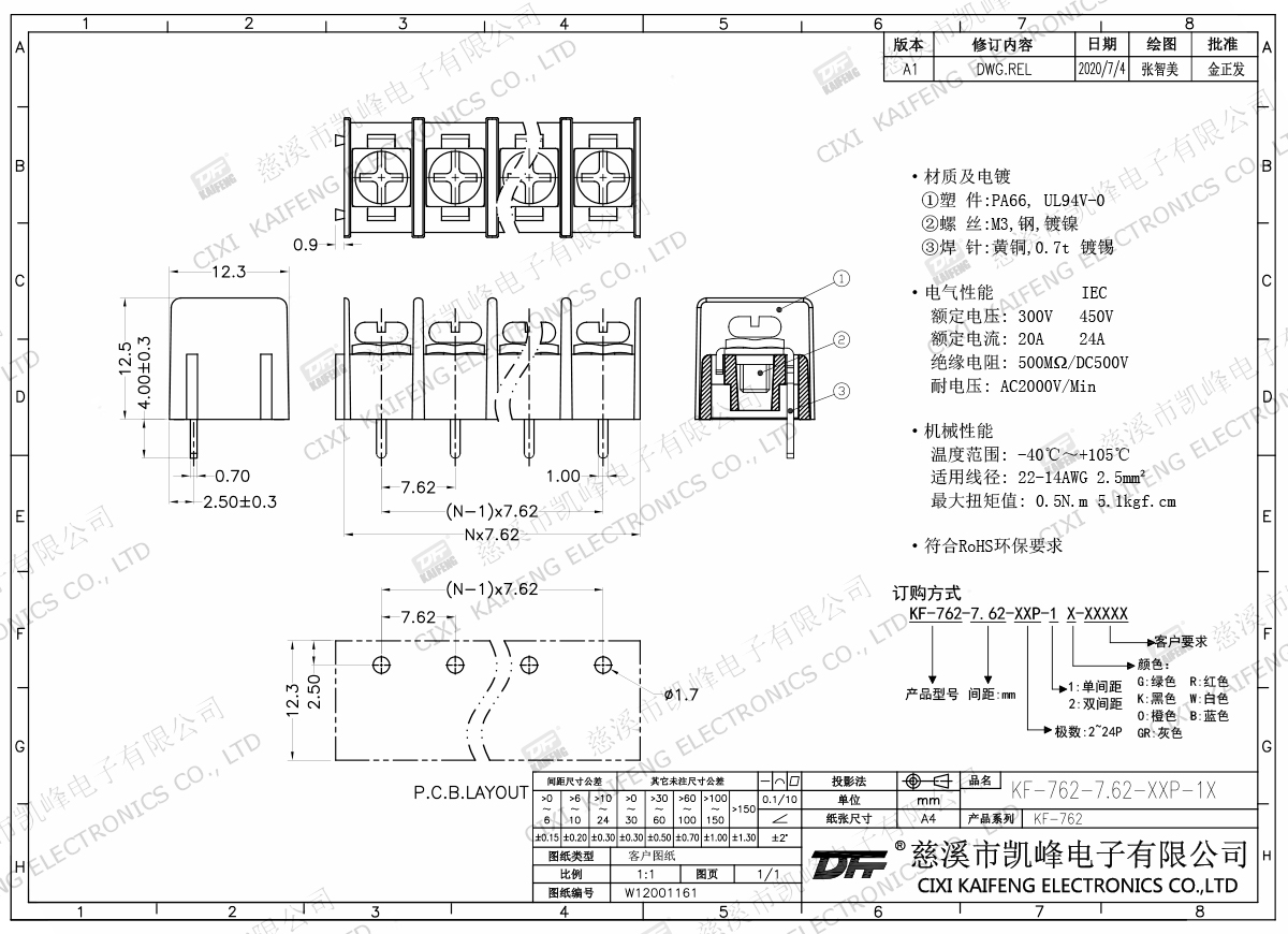 柵欄式接線端子 材質(zhì)電鍍:M3.0 鋼,鍍鎳端子:黃銅,0.7t 鍍鎳塑件: PA66,UL94V-0電氣性能ULIEC額定電壓300V 450V 額定電流20A24A絕緣電阻500MΩ/DC500V耐電壓AC2000V/1min使用線徑22-14AWG 2.5mm2機(jī)械性能溫度范圍-40℃~+105℃ 扭矩0.5N.m 4.43Lb.in