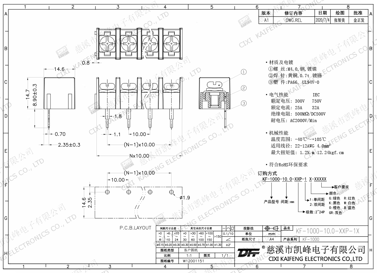 柵欄式接線端子 材質(zhì)電鍍:M4.0 鋼,鍍鎳端子:黃銅,0.7t 鍍鎳塑件: PA66,UL94V-0電氣性能ULIEC額定電壓300V 750V 額定電流25A32A絕緣電阻500MΩ/DC500V耐電壓AC2000V/1min使用線徑22-12AWG 4.0mm2機(jī)械性能溫度范圍-40℃~+105℃ 扭矩1.2N.m 10.53Lb.in