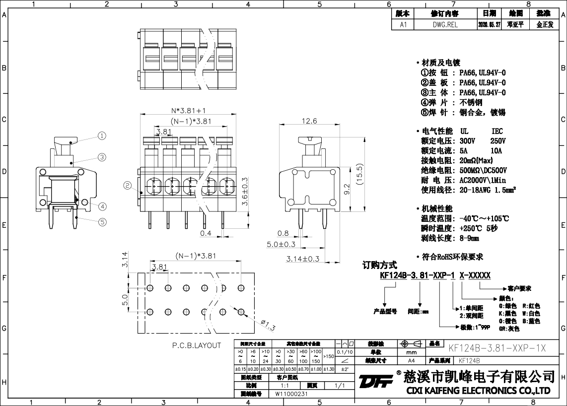 免螺絲式接線端子 材質(zhì)電鍍:①按鈕:PA66,UL94V-0②蓋板:PA66,UL94V-0③主體:PA66,UL94V-0④彈片:不銹鋼⑤焊針:黃銅,鍍錫電氣性能ULIEC額定電壓300V 250V 額定電流5A 10A接觸電阻20mΩ絕緣電阻500MΩ/DC500V耐電壓AC2000V/1min使用線徑20-18AWG 1.5mm2機(jī)械性能溫度范圍-40℃
