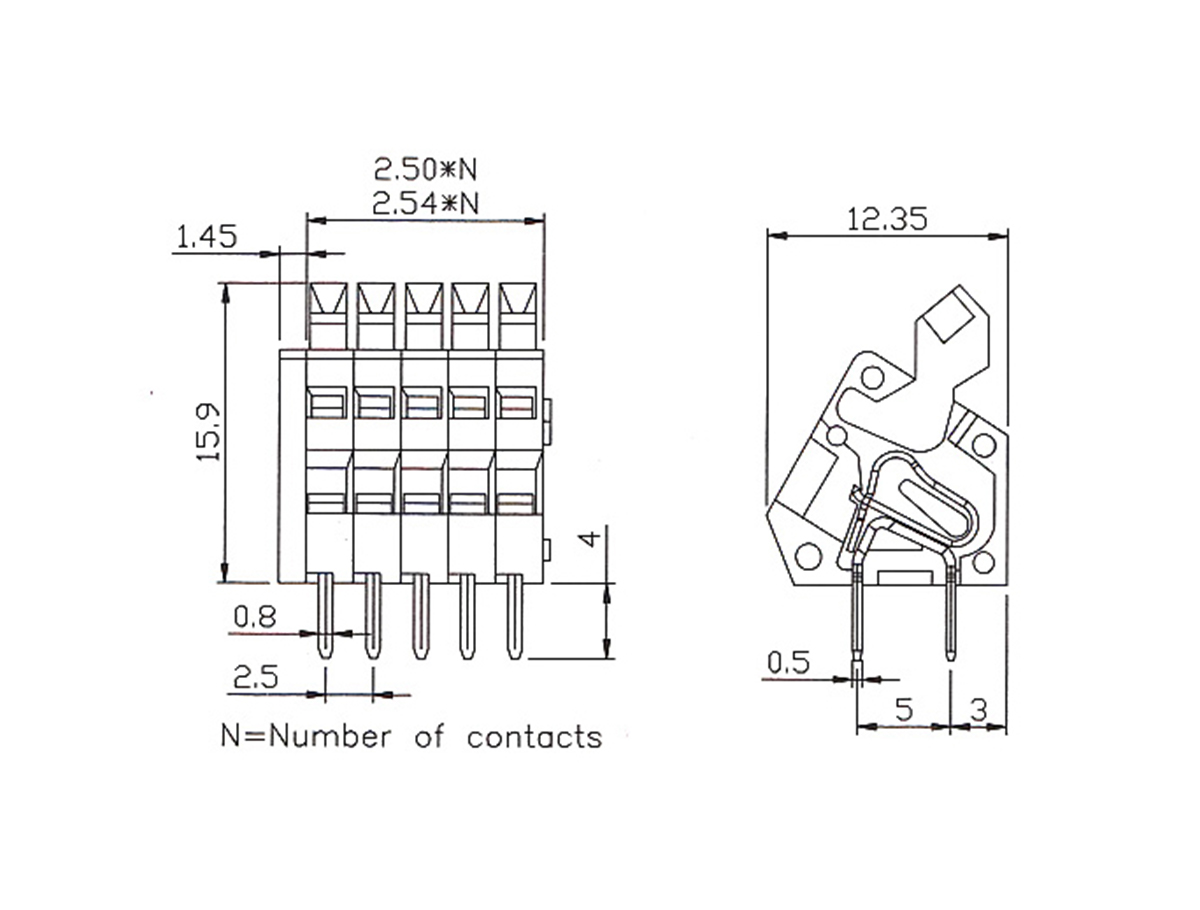 免螺絲式接線端子 材質電鍍:①彈片:不銹鋼②塑件:PA66,UL94V-0③焊針:黃銅,鍍錫電氣性能ULIEC額定電壓150V 額定電流4A接觸電阻20mΩ絕緣電阻500MΩ/DC500V耐電壓AC1250V/1min使用線徑28-20AWG 0.5mm2機械性能溫度范圍-40℃~+105℃