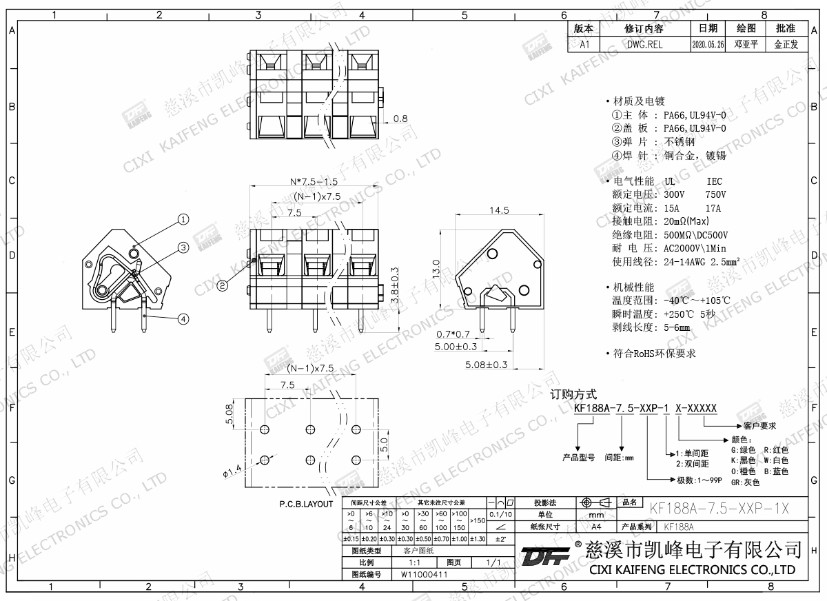 免螺絲式接線端子 材質(zhì)電鍍:材質(zhì)及電鍍①主體:PA66,UL94V-0②蓋板:PA66,UL94V-0③彈片:不銹鋼④焊針:黃銅,鍍錫電氣性能ULIEC額定電壓300V 750V額定電流15A17A接觸電阻20mΩ絕緣電阻500MΩ/DC500V耐電壓AC2000V/1min使用線徑24-14AWG 2.5mm2機(jī)械性能溫度范圍-40℃~+105℃ 瞬時溫度+250℃,5sec扭矩