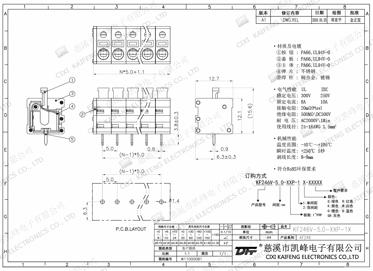 免螺絲式接線端子 材質(zhì)電鍍:①按鈕:PA66,UL94V-0②蓋板:PA66,UL94V-0③主體:PA66,UL94V-0④彈片:不銹鋼⑤焊針:黃銅,鍍錫電氣性能ULIEC額定電壓300V 250V 額定電流8A10A接觸電阻20mΩ絕緣電阻500MΩ/DC500V耐電壓AC2000V/1min使用線徑24-16AWG 1.5mm2機械性能溫度范圍-40℃~+105℃ 瞬