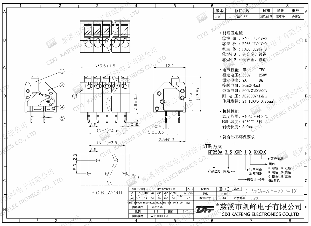 材質(zhì)電鍍:①按鈕:PA66,UL94V-0②蓋板:PA66,UL94V-0③主體:PA66,UL94V-0④焊針A:黃銅,鍍錫⑤焊針B:黃銅,鍍錫電氣性能ULIEC額定電壓300V 250V 額定電流7A6A接觸電阻20mΩ絕緣電阻500MΩ/DC500V耐電壓AC2000V/1min使用線徑24-18AWG 0.5mm2機(jī)械性能溫度范圍-40℃~+105℃ 瞬時溫