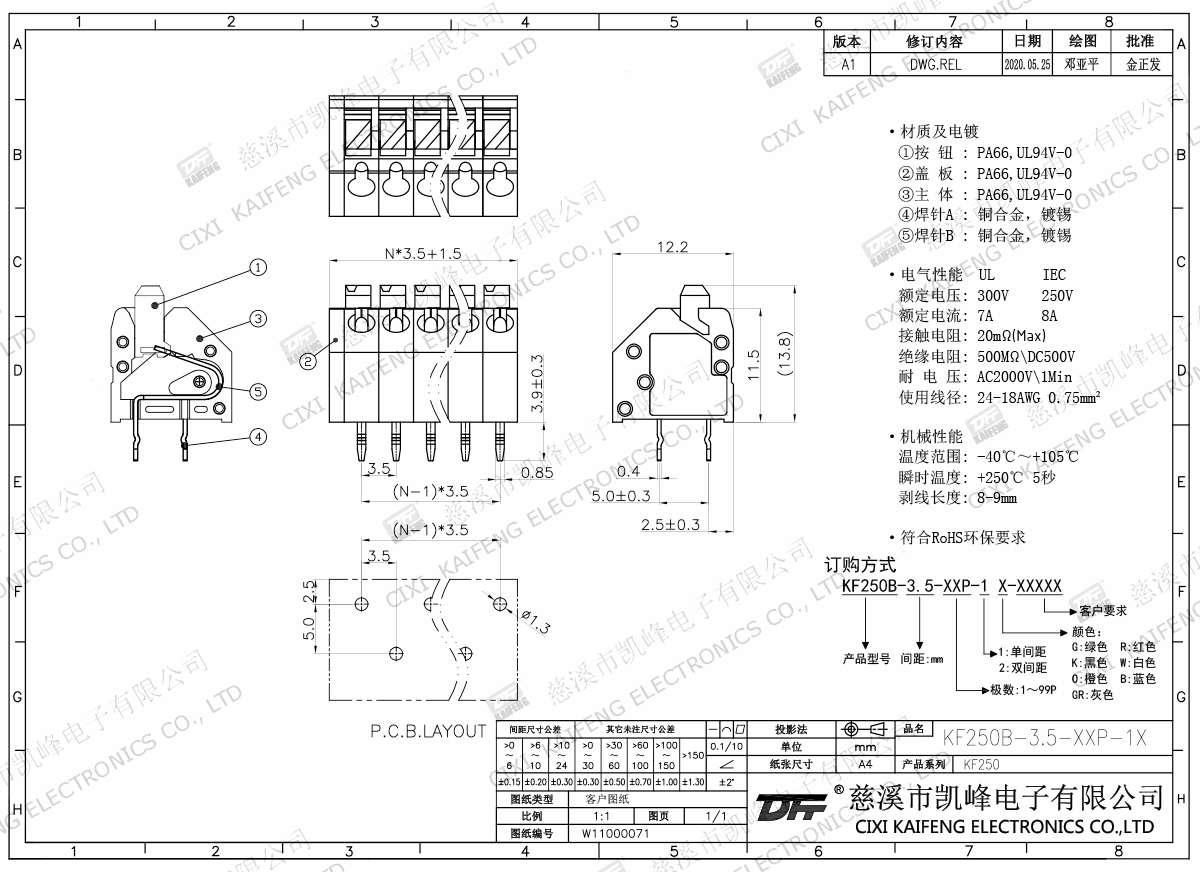 免螺絲式接線端子 材質電鍍:材質及電鍍①按鈕:PA66,UL94V-0②蓋板:PA66,UL94V-0③主體:PA66,UL94V-0④焊針A:黃銅,鍍錫⑤焊針B:黃銅,鍍錫電氣性能ULIEC額定電壓300V 450V 額定電流7A9A接觸電阻20mΩ絕緣電阻500MΩ/DC500V耐電壓AC2000V/1min使用線徑24-18AWG 0.75mm2機械性能溫度范圍-40℃~+105℃ 瞬時