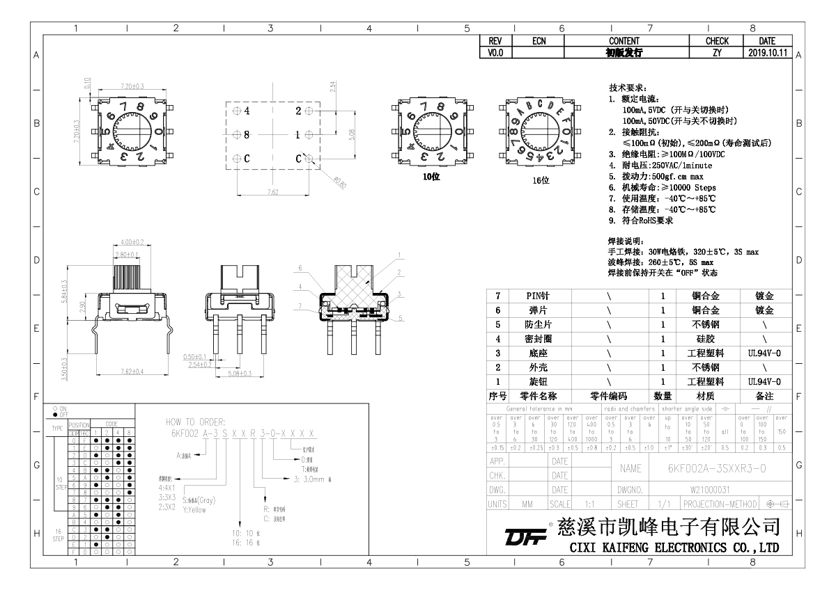 旋鈕開關 材質電鍍:性能說明額定電流開與關切換時100mA,5VDC開與關不切換時100mA,50VDC接觸電阻≤100mΩ(初始),≤200mΩ(壽命測試后)絕緣電阻≥100mΩ/100VDC耐電壓250VAC/1min操作力500gf.cm/Max機械壽命≥10000 Steps密封性IP67使用溫度-40℃~+85℃儲存溫度-40℃~+85℃材質說明底座工程塑料,UL94V-0蓋板工程塑料,UL94