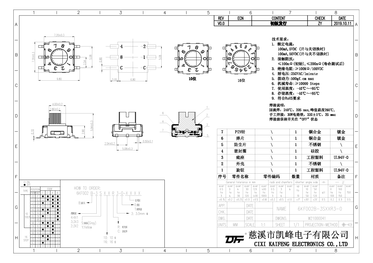 旋鈕開關(guān) 材質(zhì)電鍍:額定電流開與關(guān)切換時(shí)100mA,5VDC開與關(guān)不切換時(shí)100mA,50VDC接觸電阻≤100mΩ(初始),≤200mΩ(壽命測試后)絕緣電阻≥100mΩ/100VDC耐電壓250VAC/1min操作力500gf.cm/Max機(jī)械壽命≥10000 Steps密封性IP67使用溫度-40℃~+85℃儲(chǔ)存溫度-40℃~+85℃材質(zhì)說明底座工程塑料,UL94V-0蓋板工程塑料,UL94