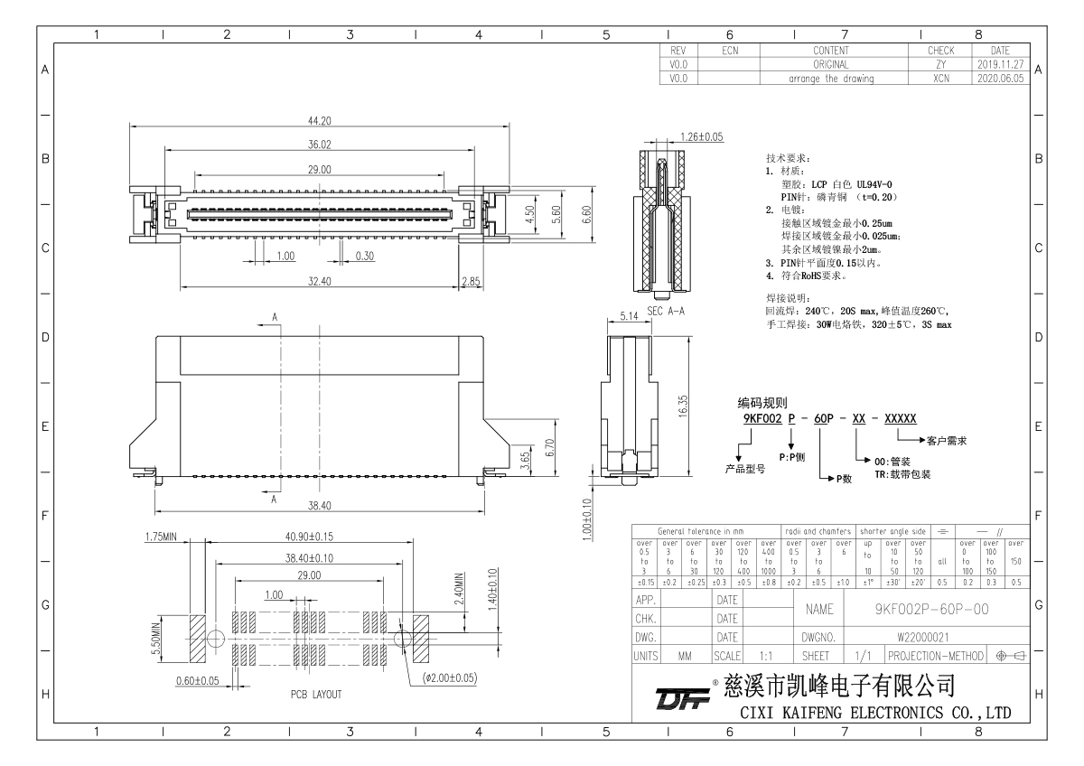 材質(zhì)電鍍:材質(zhì)說(shuō)明塑膠LCP 白色 UL94V-0PIN針磷青銅(t=0.20)電鍍接觸區(qū)域鍍金最小0.25um;焊接區(qū)域鍍金最小0.025um;其余區(qū)域鍍鎳最小2um;PIN針平面度0.15以內(nèi)符合ROHS要求焊接說(shuō)明:回流焊:240,20s max,峰值溫度260,手工焊接:30W電洛鐵,320正負(fù)5,3S max