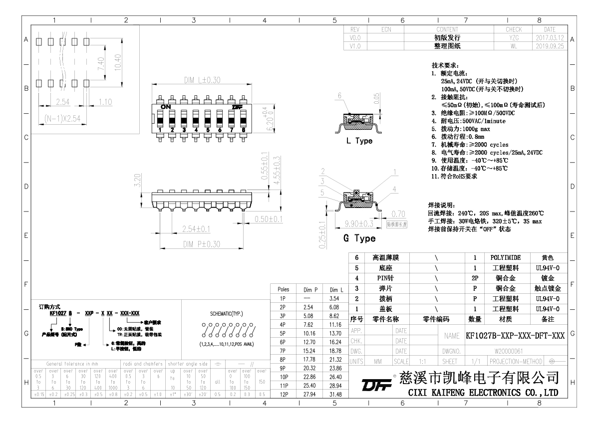 材質電鍍:性能說明額定電流開關切換的額定電流25mA,24VDC開關不切換的額定電流100mA,50VDC接觸電阻初始值50mΩ/Max測試后100mΩ/Max絕緣電阻100mΩ/Min.at 500VDC耐電壓500VAC/1min撥動力1000g/Max撥動行程0.8mm機械壽命2000cycles(Min.)電氣壽命2000 cycles/25mA,24VDC使用溫度-40℃~+85℃