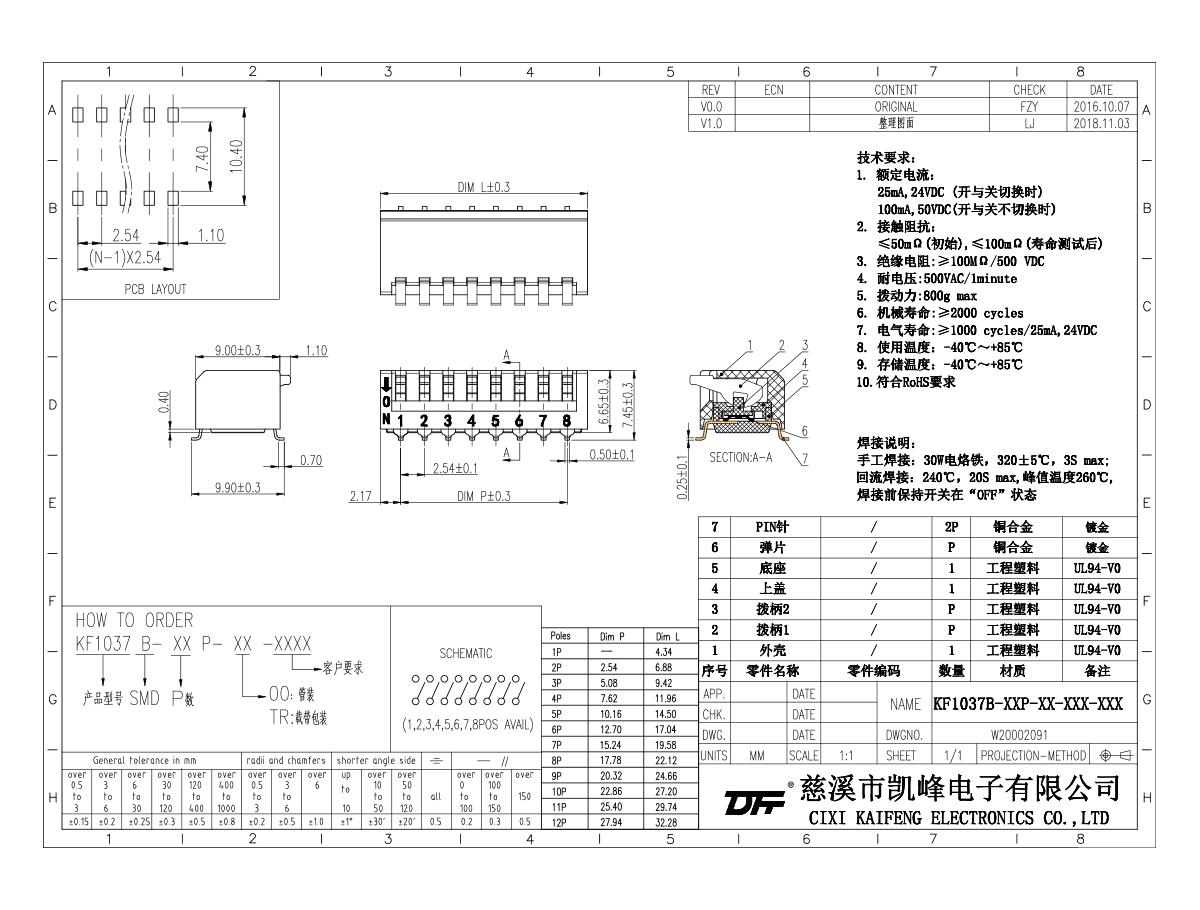 撥碼開關(guān) 材質(zhì)電鍍:UL94V-0 工程塑料,黑色 上蓋:UL94V-0 工程塑料,黑色 推鈕:UL94V-0 工程塑料,白色端子:磷青銅鍍金 彈片:鈹銅鍍金電氣性能電氣壽命:在電壓24VDC電流25mA之下測試,可來回撥動2000次開關(guān)不常切換的額定電流:100mA , 耐壓50VDC開關(guān)經(jīng)