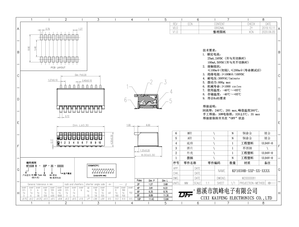 撥碼開關 材質(zhì)電鍍:25mA,24VDC開關不切換的額定電流100mA,50VDC接觸電阻初始值≤100mΩ測試后≤200mΩ絕緣電阻≥100mΩ/100VDC耐電壓300VAC/1min撥動力800g/Max機械壽命≥1000cycles使用溫度-40℃~+85℃儲存溫度-40℃~+85℃材質(zhì)說明外殼工程塑料,黑色底座工程塑料,黑色撥柄工程塑料,白色PIN針磷青銅鍍金焊