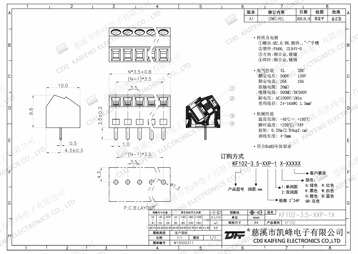 固定式式連接端子 材質(zhì)電鍍:①螺 絲 : M2.0 鋼,鍍鋅,"-"字槽 ②塑 件 : PA66, UL94V-0 ③彈 片 : 磷青銅鍍鎳或不銹鋼