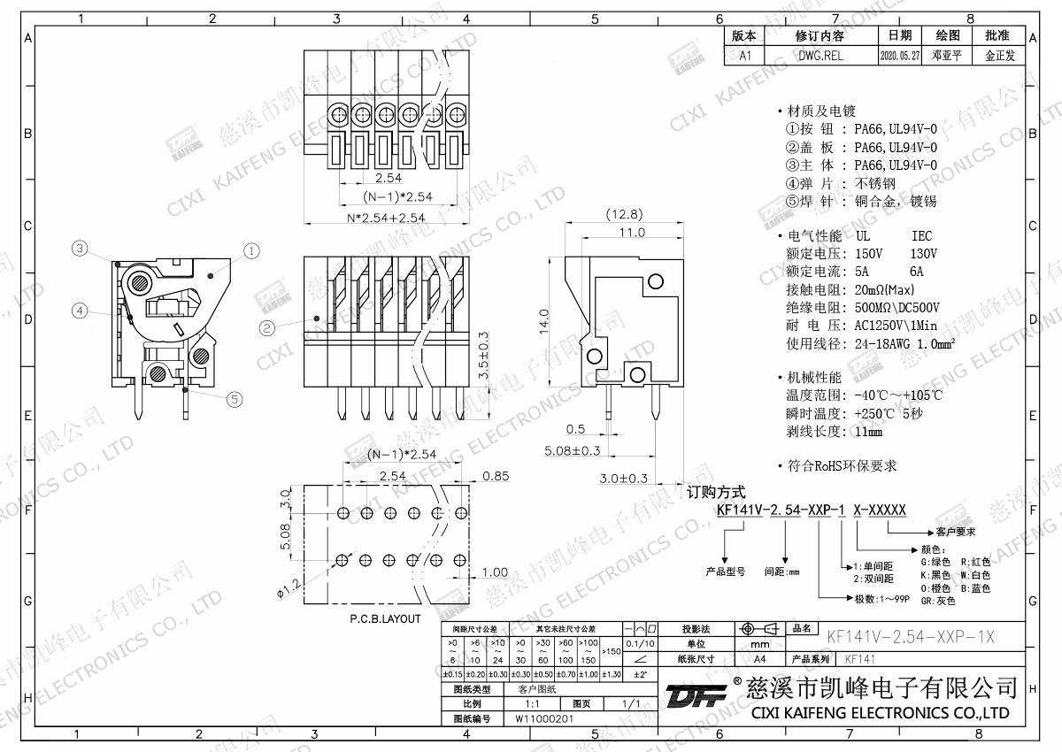免螺絲式接線端子 材質(zhì)電鍍:①按鈕:PA66,UL94V-0②蓋板:PA66,UL94V-0③主體:PA66,UL94V-0④彈片:不銹鋼⑤焊針:黃銅,鍍錫電氣性能ULIEC額定電壓150V 130V 額定電流5A6A接觸電阻20mΩ絕緣電阻500MΩ/DC500V耐電壓AC1250V/1min使用線徑24-18AWG 1.0mm2機(jī)械性能溫度范圍-40℃~+105℃ 瞬時(shí)溫度+250℃,5sec
