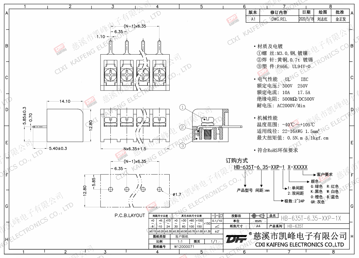 柵欄式接線端子 材質電鍍:材質及電鍍(Material)螺絲(Screw):M2.5,鋼,鍍鎳Steel,NiPlated端子(Pinheader):黃銅,0.7t鍍錫Brass,Tinplated塑件(Housing):PA66,UL94V-0·電氣性能(Electrical)額定電壓(RatedVoltage):300V額定電流(RatedCurrent):16A絕緣電阻