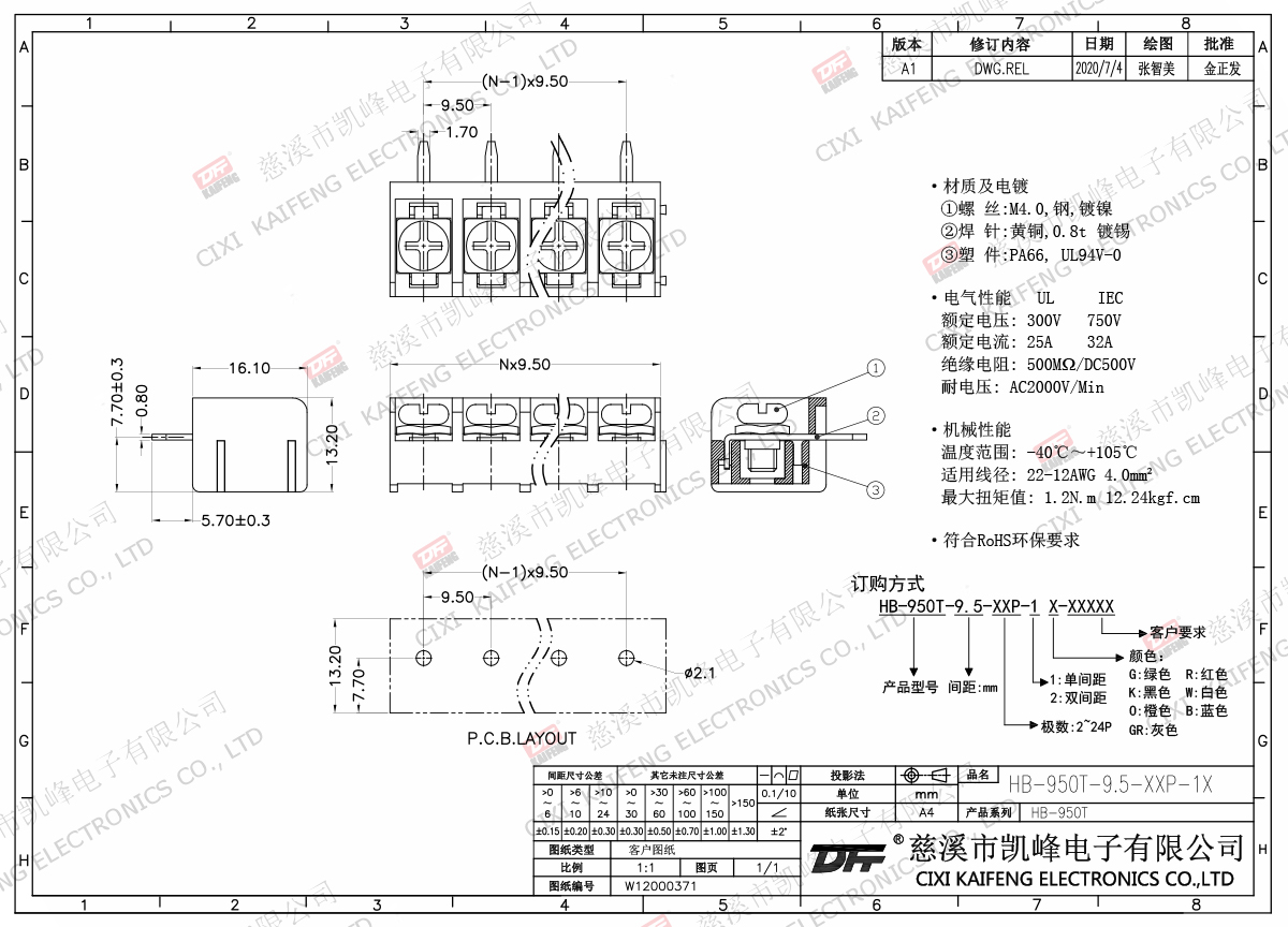 材質(zhì)電鍍:材質(zhì)及電鍍(Material)螺絲(Screw):M4.0,鋼,鍍鎳Steel,NiPlated端子(Pinheader):黃銅,0.8t鍍錫Brass,Tinplated塑件(Housing):PA66,UL94V-0·電氣性能(Electrical)額定電壓(RatedVoltage):300V額定電流(RatedCurrent):25A絕緣電阻