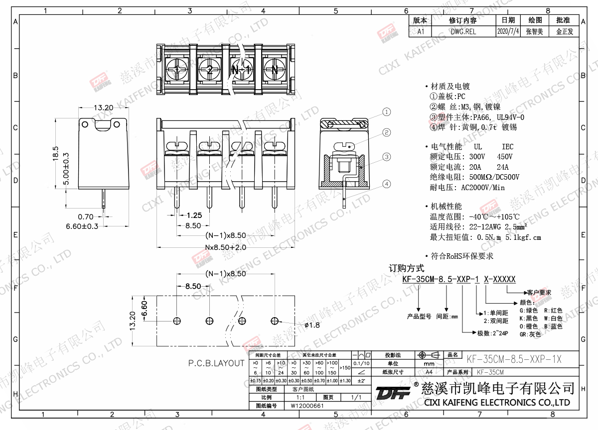 柵欄式接線(xiàn)端子 材質(zhì)電鍍:M3.0 鋼,鍍鎳端子:黃銅,0.7t 鍍鎳塑件: PA66,UL94V-0電氣性能ULIEC額定電壓300V 450V 額定電流20A24A絕緣電阻500MΩ/DC500V耐電壓AC2000V/1min使用線(xiàn)徑22-12AWG 2.5mm2機(jī)械性能溫度范圍-40℃~+105℃ 扭矩0.5N.m 4.4Lb.in