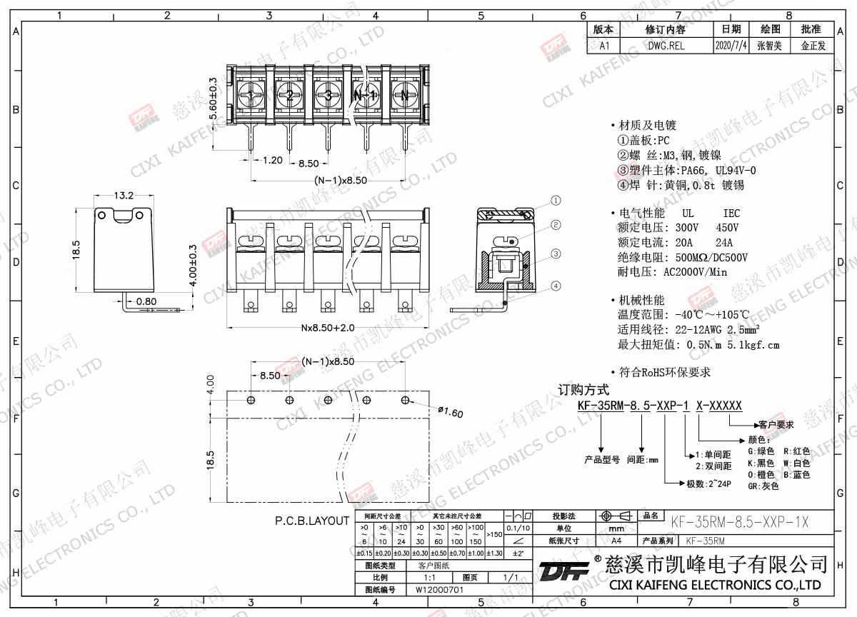 柵欄式接線端子 材質(zhì)電鍍:M3.0 鋼,鍍鎳端子:黃銅,0.8t 鍍鎳塑件: PA66,UL94V-0電氣性能ULIEC額定電壓300V 450V 額定電流20A24A絕緣電阻500MΩ/DC500V耐電壓AC2000V/1min使用線徑22-12AWG 2.5mm2機(jī)械性能溫度范圍-40℃~+105℃ 扭矩0.5N.m 4.4Lb.in