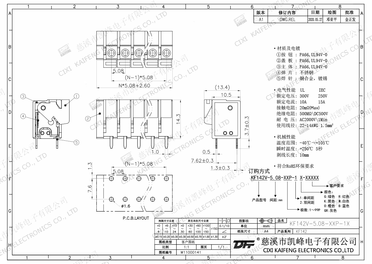 免螺絲式接線端子 材質(zhì)電鍍:①按鈕:PA66,UL94V-0②蓋板:PA66,UL94V-0③主體:PA66,UL94V-0④彈片:不銹鋼⑤焊針:黃銅,鍍錫電氣性能ULIEC額定電壓300V 250V 額定電流10A15A接觸電阻20mΩ絕緣電阻500MΩ/DC500V耐電壓AC2000V/1min使用線徑22-14AWG 1.5mm2機(jī)械性能溫度范圍-40℃~+105℃ 瞬時(shí)溫度+250℃,5sec