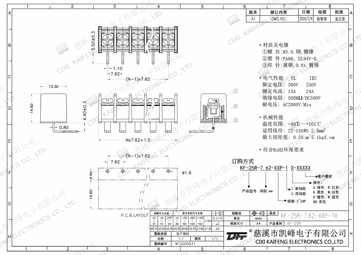 材質(zhì)電鍍:M3.0 鋼,鍍鎳端子:黃銅,0.8t 鍍鎳塑件: PA66,UL94V-0電氣性能ULIEC額定電壓300V 250V 額定電流15A24A絕緣電阻500MΩ/DC500V耐電壓AC2000V/1min使用線(xiàn)徑22-14AWG 2.5mm2機(jī)械性能溫度范圍-40℃~+105℃ 扭矩0.5N.m 4.4Lb.in