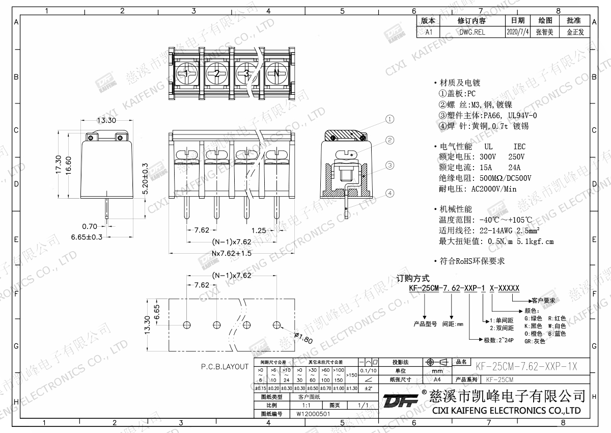柵欄式接線端子 材質(zhì)電鍍:M3.0 鋼,鍍鎳端子:黃銅,0.7t 鍍鎳塑件: PA66,UL94V-0電氣性能ULIEC額定電壓300V 250V 額定電流15A24A絕緣電阻500MΩ/DC500V耐電壓AC2000V/1min使用線徑22-14AWG 2.5mm2機械性能溫度范圍-40℃~+105℃ 扭矩0.5N.m 4.4Lb.in