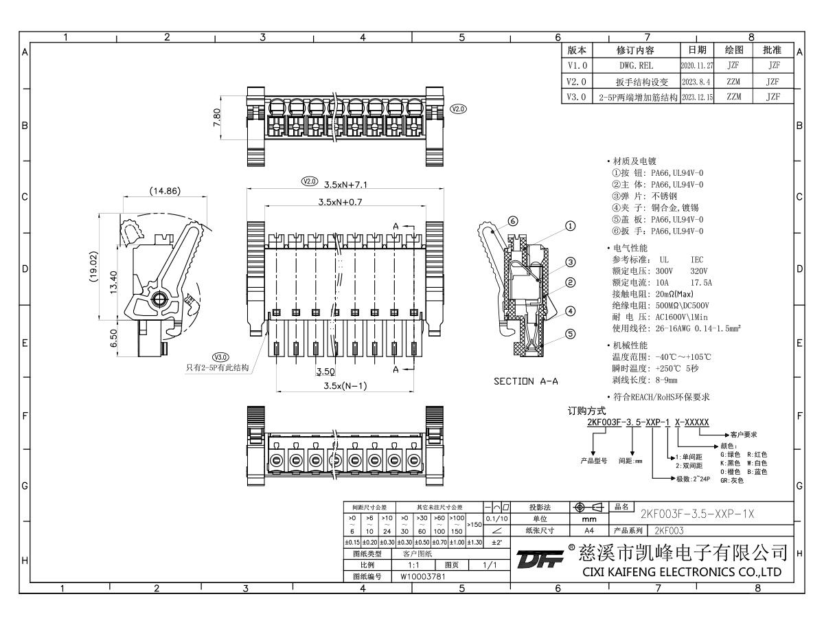 插拔式連接端子 材質(zhì)電鍍:①彈片:PA66,UL94V-0 ②夾子 : 不繡鋼3 按鈕:磷青銅電氣性能UL IEC 額定電壓300V 320V &