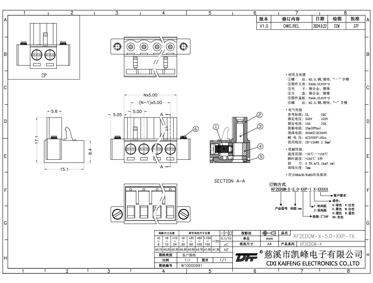 材質電鍍:M3.0 鋼 鍍鋅 ,"一"字槽觸點: -焊針:-塑件: PA66,UL94V-0電氣性能ULIEC額定電壓300V 320V 額定電流15A20A接觸電阻20mΩ絕緣電阻500MΩ/DC500V耐電壓AC2000V/1min使用線徑28-12AWG 2.5㎜2機械性能溫度范圍-40℃~+105℃ 瞬時溫度+