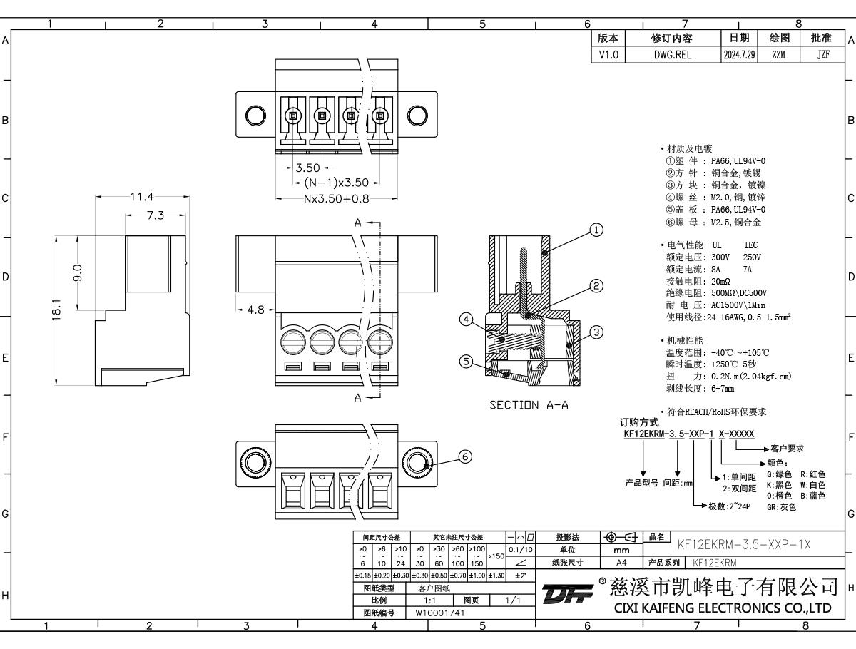 插拔式連接端子 材質(zhì)電鍍:M2.5,鋼,鍍鋅夾子:磷青銅,鍍鎳觸點(diǎn):黃銅,鍍鎳塑件:PA66,UL94V-0電氣性能ULIEC額定電壓300V250V額定電流8A7A接觸電阻20mΩ絕緣電阻500MΩ/DC500V耐電壓AC1500V/1min使用線徑26-28AWG0.5-1.5mm2機(jī)械性能溫度范圍-40℃~+105℃瞬時(shí)溫度+250℃,5sec扭矩0.2N.m2.4kgf.cm剝線長度6-7mm