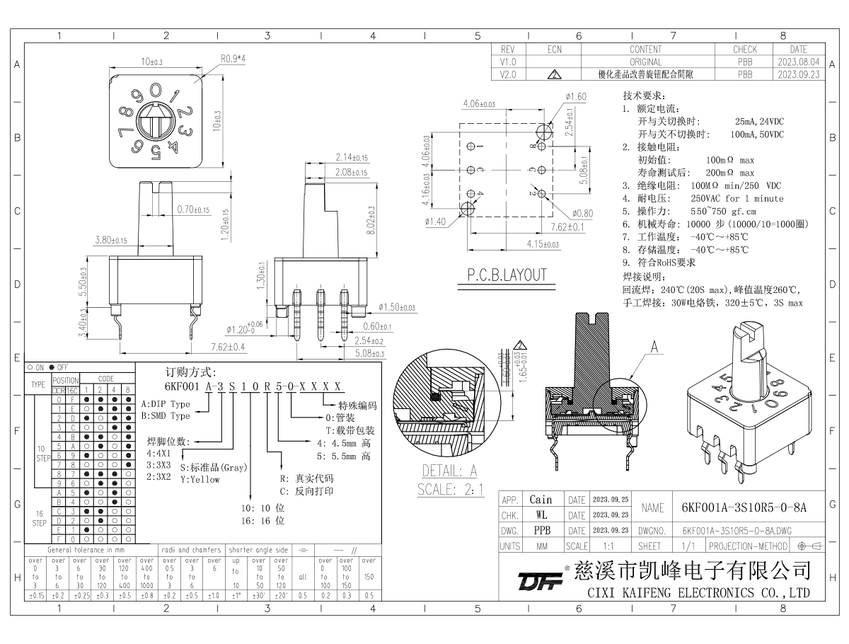旋鈕開關(guān) 材質(zhì)電鍍:25mA,24VDC 開與關(guān)不切換時(shí):100mA,50VDC 接觸電阻初始值:100mΩ max壽命測試后:200mΩ max絕緣電阻 :100mΩ min/250 VDC耐電壓 :250VAC for 1 minute操作力 :500~750gf.cm max機(jī)械壽命 :10000步