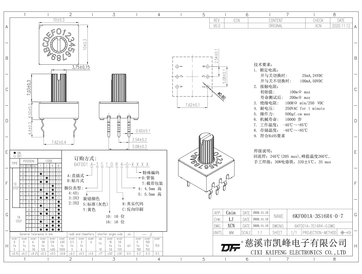 旋鈕開關(guān) 材質(zhì)電鍍:25mA,24VDC 開與關(guān)不切換時(shí):100mA,50VDC 接觸電阻初始值:100mΩ max壽命測試后:200mΩ max絕緣電阻 :100mΩ min/250 VDC耐電壓 :250VAC for 1 minute操作力 :500gf.cm max機(jī)械壽命 :10000步