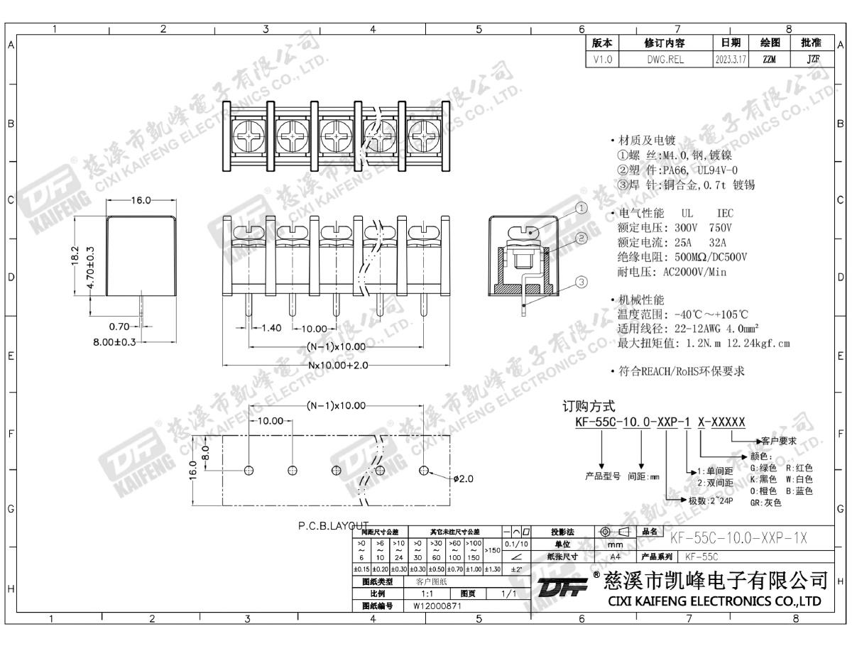 柵欄式接線端子 材質電鍍:M4.0 鋼,鍍鎳端子:黃銅,0.8t 鍍鎳塑件: PA66,UL94V-0電氣性能ULIEC額定電壓300V 750V 額定電流25A32A絕緣電阻500MΩ/DC500V耐電壓AC2000V/1min使用線徑22-12AWG 4.0mm2機械性能溫度范圍-40℃~+105℃ 扭矩1.2N.m 10.53Lb.in