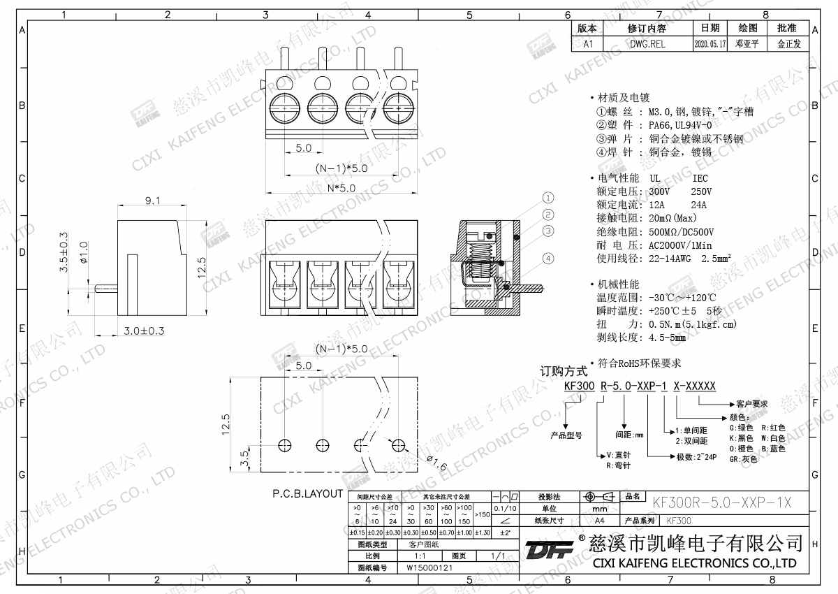 螺絲:M3.0,鋼,鍍鋅,"-"字槽 丨 觸點(diǎn):- 丨 焊針:銅合金,鍍錫 丨 塑件:PA66 UL94V-0 丨 電氣性能:ULIEC 丨 額定電壓:250V-300V 丨 額定電流:12A-24A 丨 接觸電阻:20mΩ 丨 絕緣電阻:500MΩ/DC500V 丨 耐電壓:AC1250V/1min 丨 使用線徑:x-14AWG 1.0-2.5mm2 丨 機(jī)械性能溫度范圍:-40℃~+105℃ 丨 瞬時(shí)溫度:+250℃,5sec